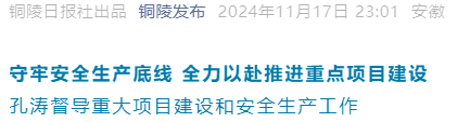 11月15日下午,市委副書記、市長孔濤深入郊區、樅陽縣督導重大項目建設和安全生產工作。市委常委、常務副市長何田,市政協副主席王友貴,市政府秘書長鐘鋒參加。