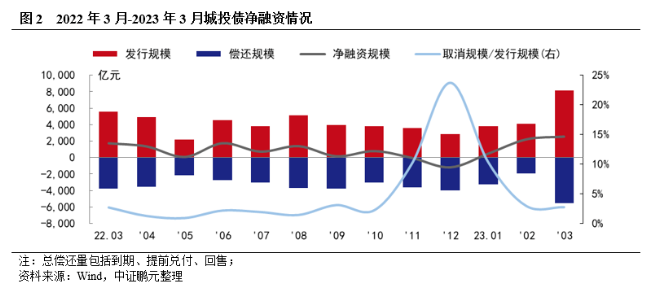 3月份,城投債償還債券規(guī)模5,563.07億元,凈融資規(guī)模2,555.35億元,同比增長46%、環(huán)比增長15%,處于歷史較高資水平。當(dāng)前,城投債供求旺盛,3月份城投債凈資規(guī)模占全信用債市場凈融資規(guī)模的181%。綜合2023年1-3月份,城投債累計凈融資規(guī)模5,270.79億元,累計同比下降7.66%,累計凈融資占全信用債市場凈融資規(guī)模的50%。