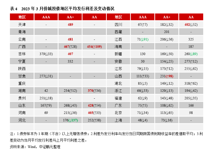 就地區(qū)發(fā)行利差來看,2023年3月份,發(fā)行利差相對較高的地區(qū):AAA級城投債中的吉林地區(qū)的發(fā)行利差為379BP;AA+級城投債中,天津、青海、云南、廣西、吉林、寧夏、陜西的發(fā)行利差分別為489BP、489BP、481BP、467BP、407BP、332BP、322BP;AA級城投債中,河南、廣西、山東、重慶、四川、湖南、江西、湖北的發(fā)行利差分,為465BP、454BP、428BP、428BP、402BP、370BP、325BP、318BP。