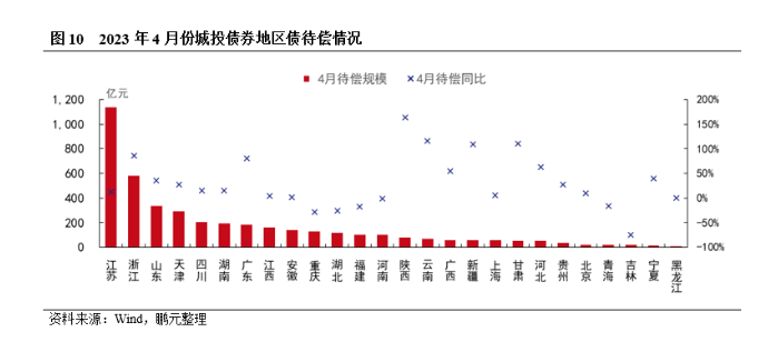 4月份全國城投債待償規(guī)模4,237.80億元,同比增長20%,環(huán)比下降24%,其中江蘇待償1,135.55億元、浙江待償580.28億元、山東待償336.10億元、天津待償291.55億元、四川待償206.44億元。"