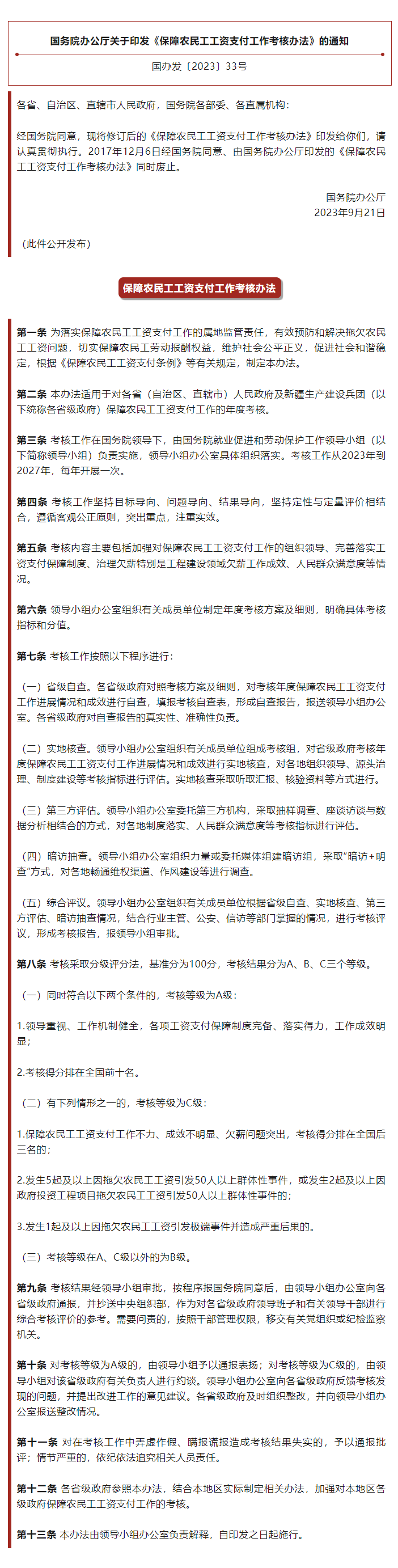 國務院辦公廳關于印發《保障農民工工資支付工作考核辦法》的通知