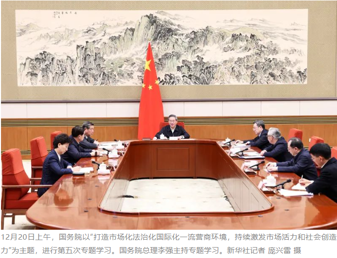 12月20日上午,國務院以“打造市場化法治化國際化一流營商環境,持續激發市場活力和社會創造力”為主題,進行第五次專題學習。國務院總理李強主持專題學習。華東政法大學教授羅培新作了講解。國務院副總理丁薛祥,國務委員王小洪、吳政隆作交流發言。
