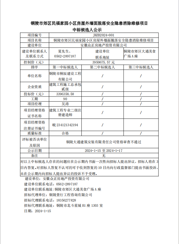 銅陵市郊區民福家園小區房屋外墻面脫落安全隱患消除維修項目中標候選人公示?
