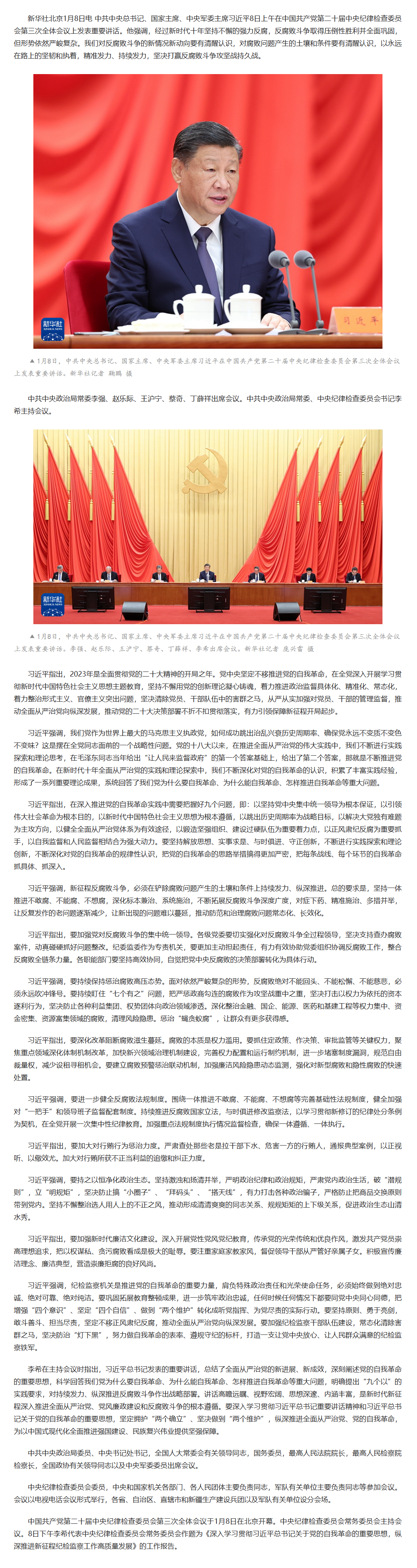 習近平在二十屆中央紀委三次全會上發表重要講話強調 深入推進黨的自我革命 堅決打贏反腐敗斗爭攻堅戰持久戰