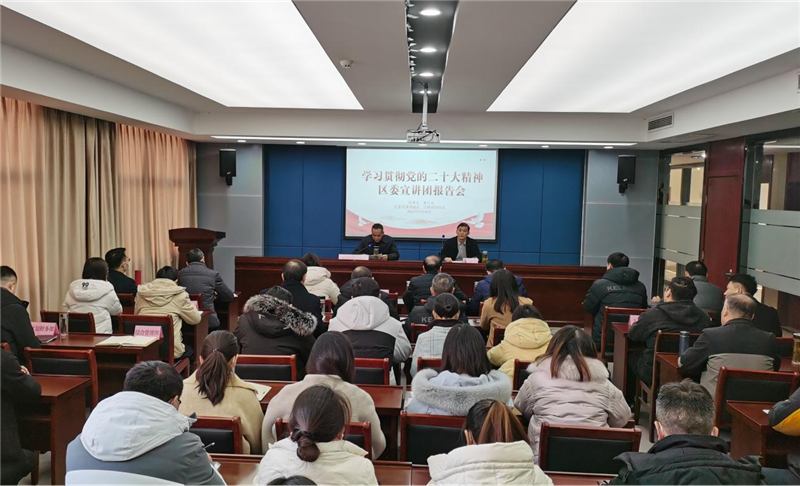 2023年1月30日,區委宣講團走進金誠投資集團,專題宣講黨的二十大精神。區委宣講團成員、區財政局局長、區金融局局長夏付兵以“學習貫徹黨的二十大精神”為主題作專題報告,報告會由金誠投資集團黨總支書記、董事長鄧國生主持。